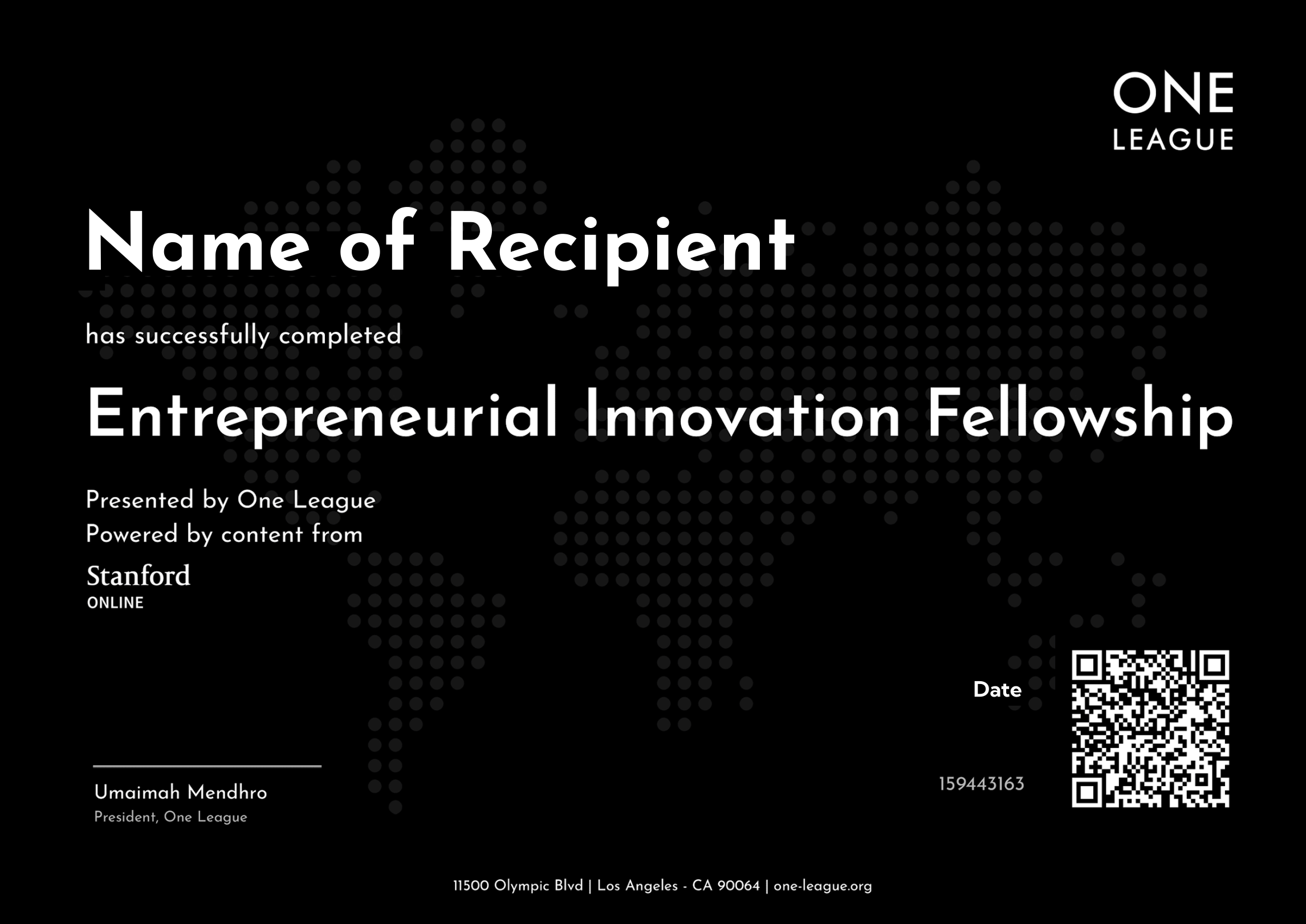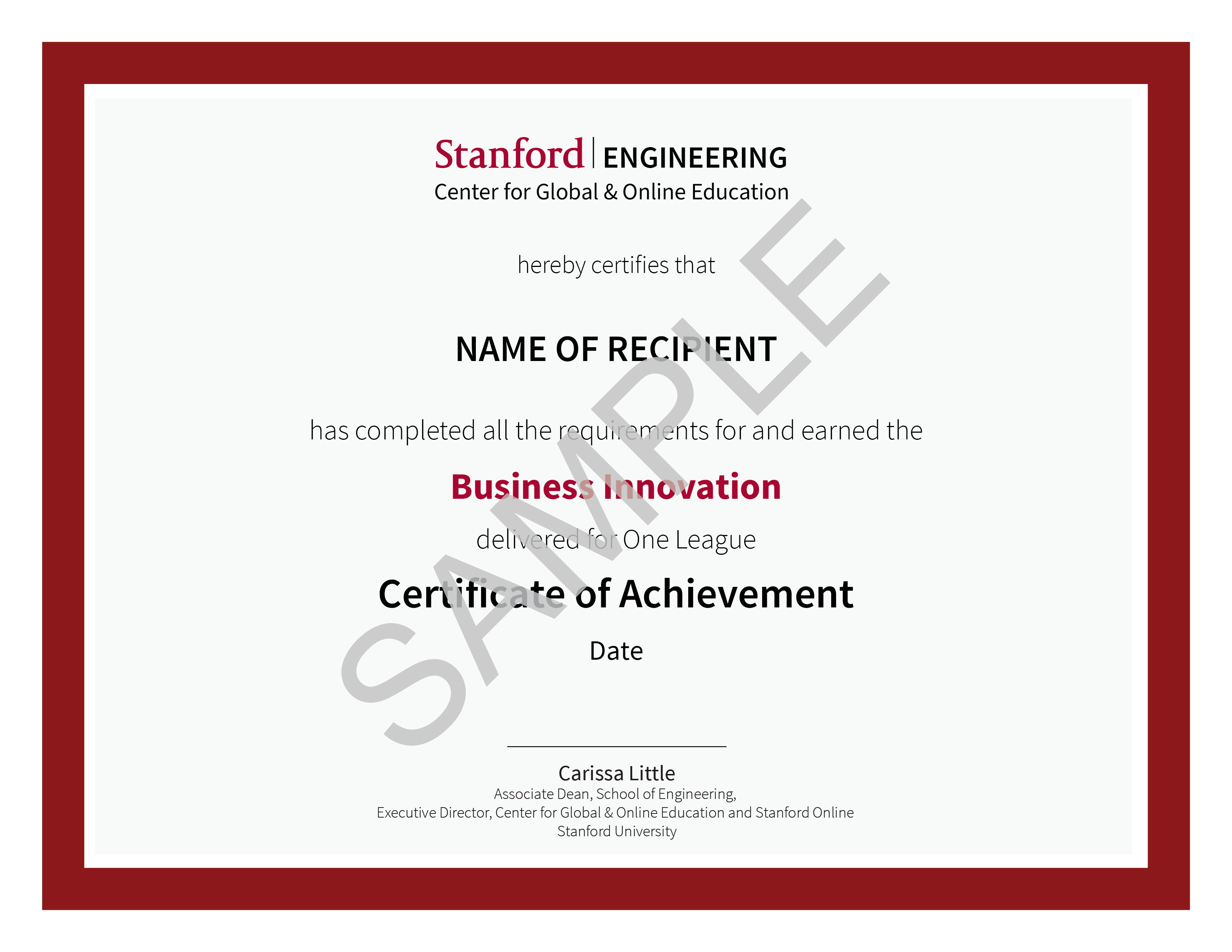 Upon completion of the required Stanford Online courses described above, One League participants will earn a Certificate of Achievement in Business Innovation issued by the Stanford Engineering Center for Global and Online Education.