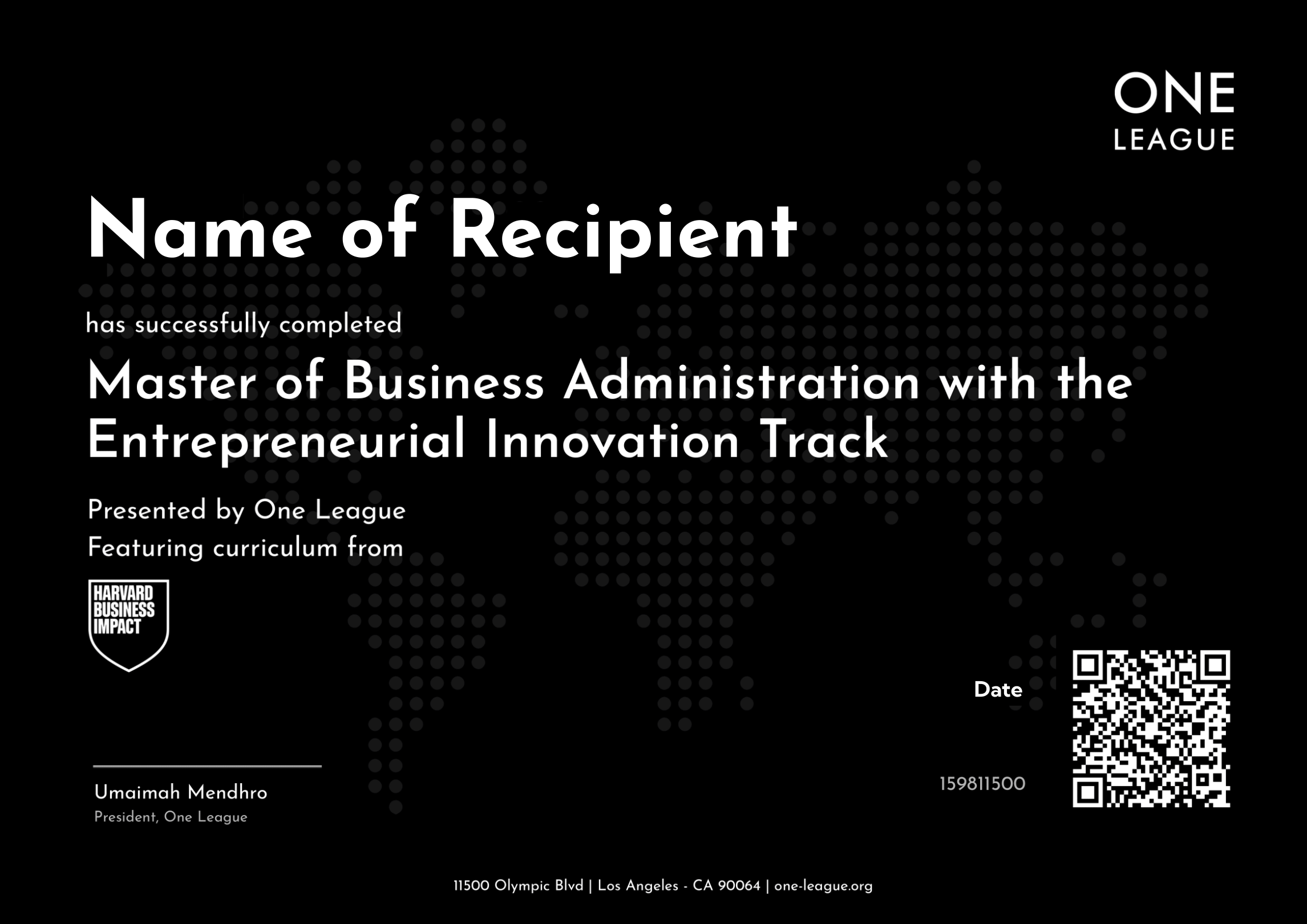 Complete the Business Management Fellowship, serving as the core curriculum for the program, and choose between the Generative AI & Data Science Fellowship or Entrepreneurial Innovation Fellowship to receive a Master of Business Administration (MBA) degree from One League.